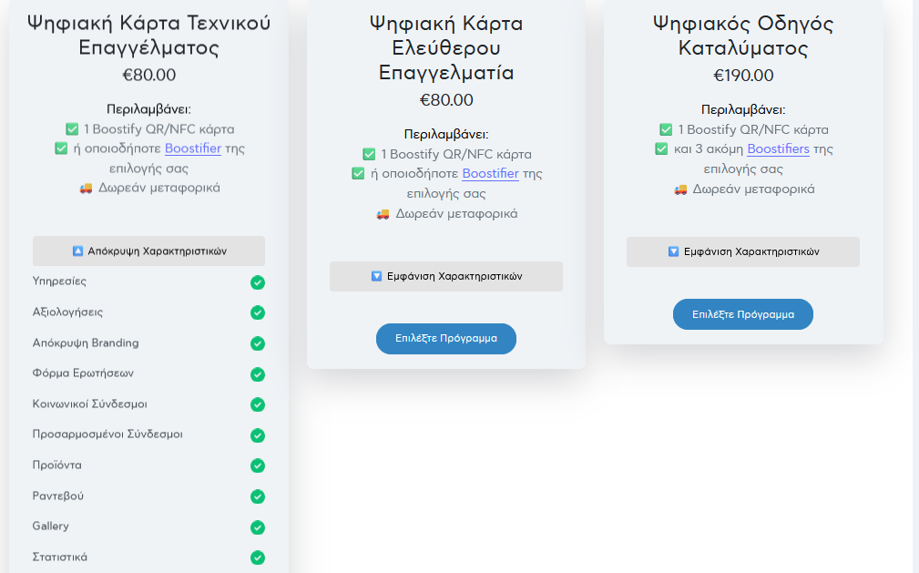 - Ετικέτες δυνατοτήτων: έγχρωμες ενδείξεις (Υπηρεσίες, Αξιολογήσεις, Απόκρυψη Branding, Gallery, Στατιστικά κ.λπ.) δείχνουν ποιες λειτουργίες περιλαμβάνει το πακέτο. Για επιπλέον δυνατότητες απαιτείται αναβάθμιση.