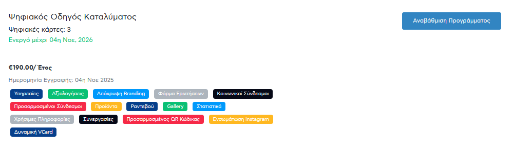 - Αναβάθμιση Προγράμματος: το κουμπί «Αναβάθμιση Προγράμματος» οδηγεί στη σελίδα επιλογής πακέτων. Χρησιμοποιήστε το μόνο όταν θέλετε αλλαγή πακέτου, καθώς η αναβάθμιση συνεπάγεται χρέωση.