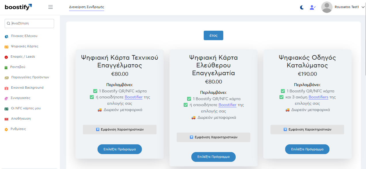 - Επισκόπηση πακέτου: εμφανίζει όνομα προγράμματος, πλήθος επιτρεπόμενων καρτών, ημερομηνία λήξης, κόστος ανά έτος και ημερομηνία εγγραφής.