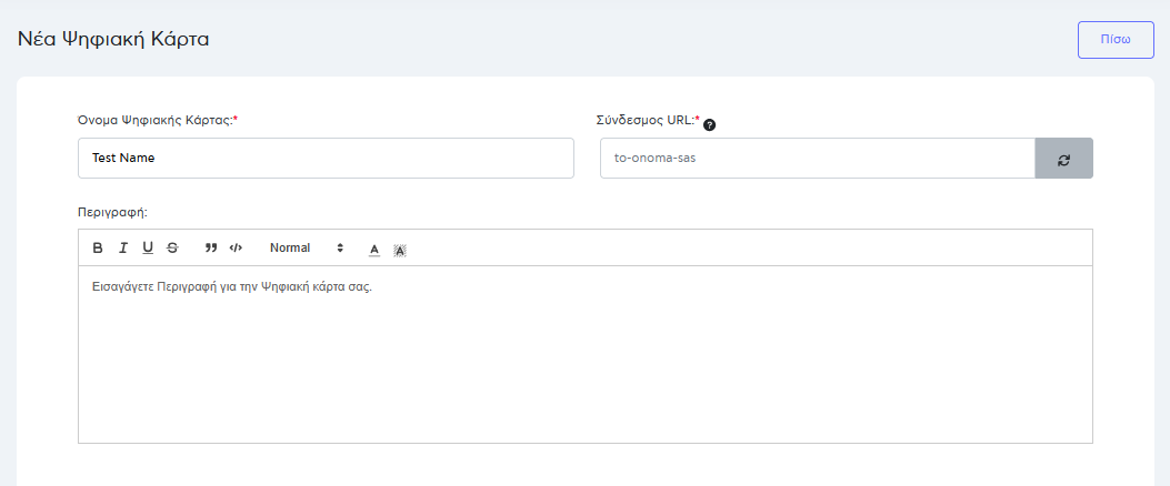 - Όνομα κάρτας & URL: Πληκτρολόγησε ονοματεπώνυμο ή τίτλο και δημιούργησε το slug που θα χρησιμοποιείται στο URL της κάρτας (λατινικοί χαρακτήρες, χωρίς κενά).
