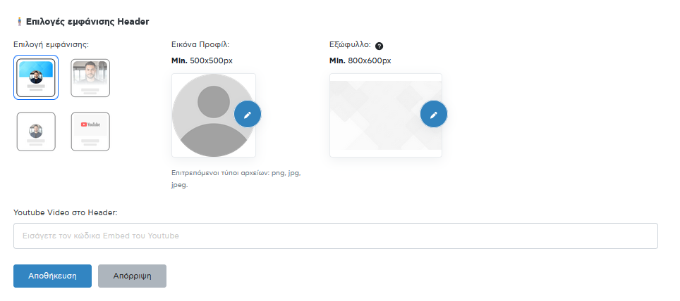 - Header & εικόνες: Επίλεξε πρότυπο κεφαλίδας, ανέβασε φωτογραφία προφίλ (≥500×500 px) και εικόνα εξωφύλλου (≥800×600 px). Υπάρχει πεδίο για ενσωμάτωση YouTube βίντεο.