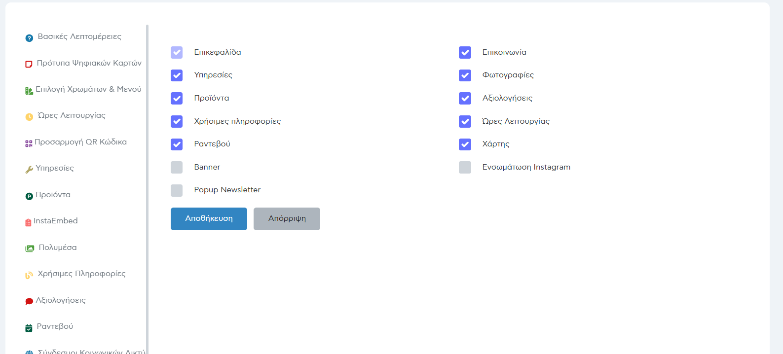 Ενεργοποίησε ή απενεργοποίησε οποιοδήποτε τμήμα της κάρτας μέσω checkbox (κεφαλίδα, επικοινωνία, υπηρεσίες, προϊόντα, φωτογραφίες, αξιολογήσεις, πληροφορίες, ωράριο, ραντεβού, χάρτης, banner, Instagram embed, newsletter). Τσέκαρε όσα θέλεις να εμφανίζονται και πάτησε «Αποθήκευση».