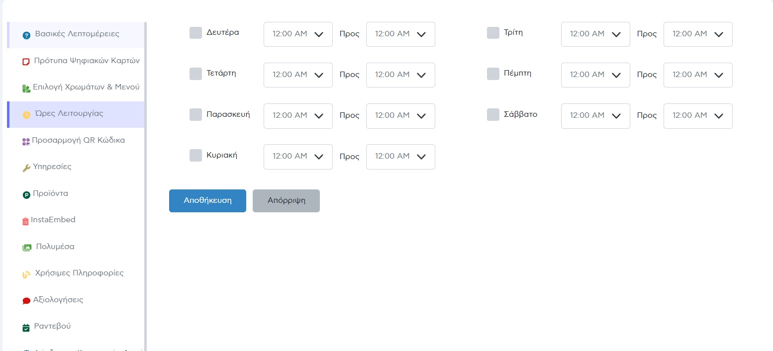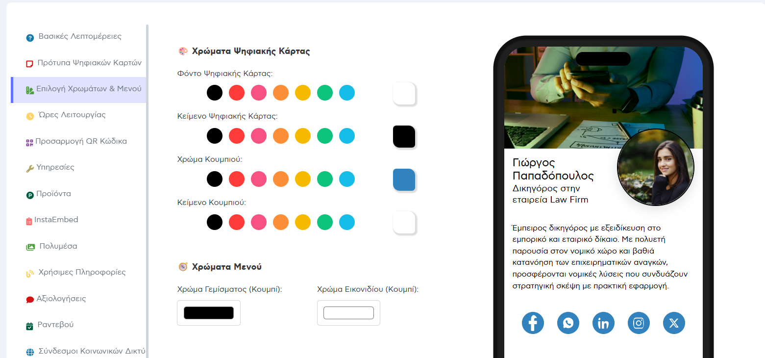 Με αυτές τις υποενότητες μπορείς να ρυθμίσεις πλήρως την ψηφιακή σου κάρτα, να ενεργοποιείς λειτουργίες ανάλογα με το πακέτο σου και να προσαρμόζεις κάθε τμήμα στις ανάγκες της επιχείρησής σου.