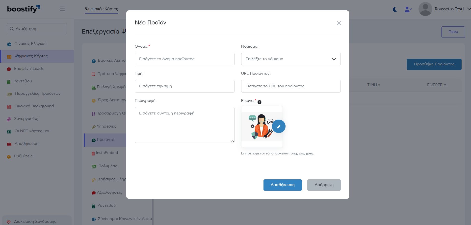Όπως οι υπηρεσίες, αλλά συμπεριλαμβάνεις και τιμή. Με «Προσθήκη Προϊόντος» συμπληρώνεις όνομα, URL, τιμή και προαιρετικό εικονίδιο.