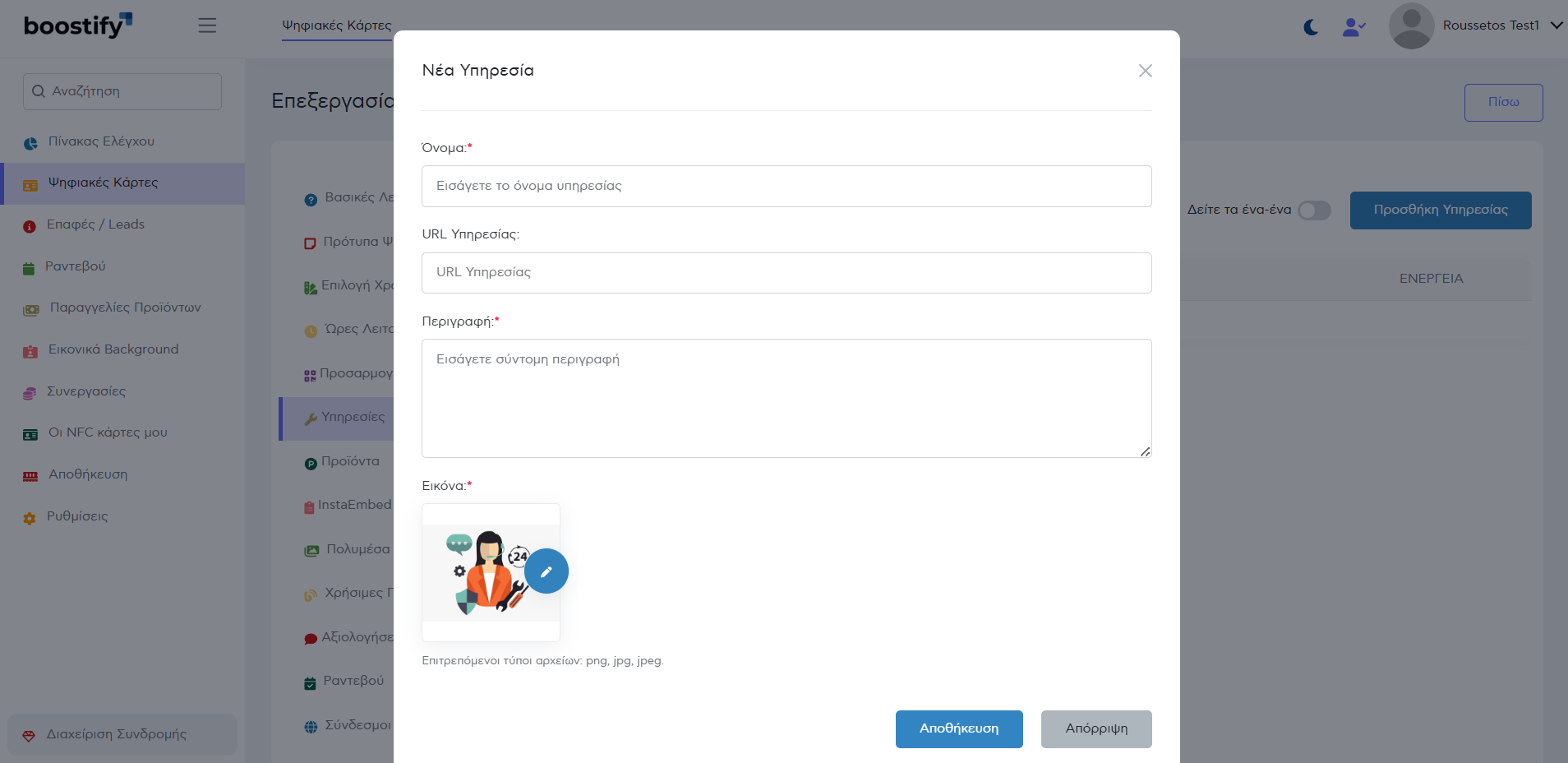 Πρόσθεσε υπηρεσίες με το κουμπί «Προσθήκη Υπηρεσίας», ανέβασε εικονίδιο, όνομα και URL. Ο πίνακας διαθέτει αναζήτηση και επιλογές επεξεργασίας/διαγραφής.