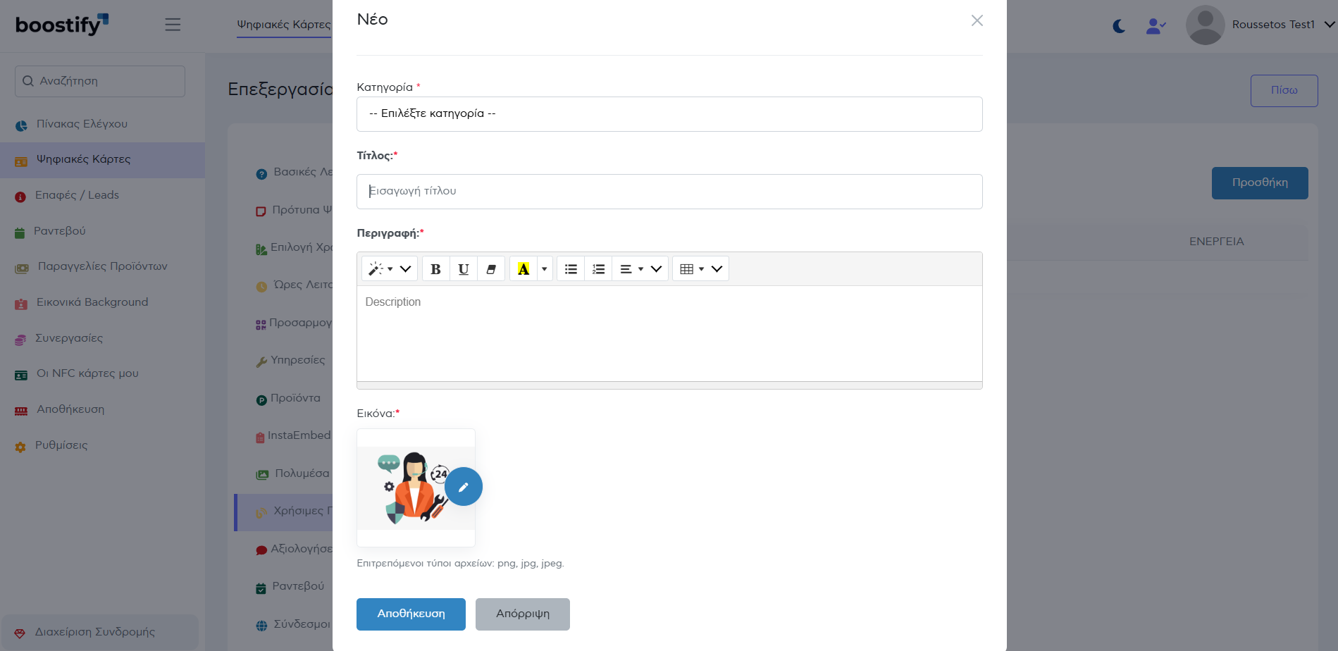 - Περιγραφή: Με τον ενσωματωμένο επεξεργαστή κειμένου γράφεις σύντομη παρουσίαση της επιχείρησης ή των υπηρεσιών σου με πλήρη μορφοποίηση.